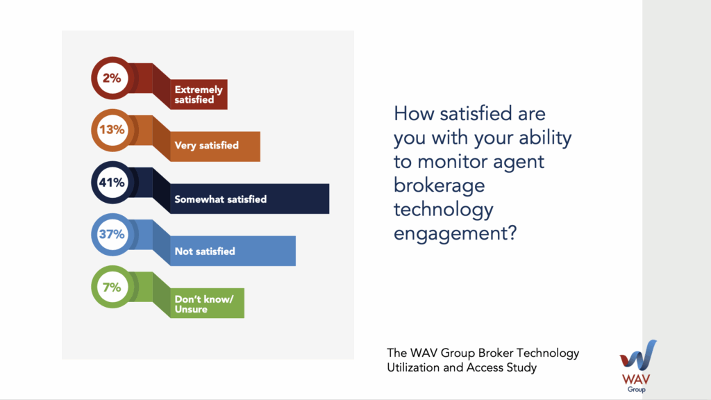 According to the WAV Group Brokerage Utilization and Access Study Part 2, nearly 80% of brokers say they’re not satisfied with their ability to monitor agent usage of the technologies they provide. The reasons vary, but the outcome is the same: brokers don’t have the information they need to make informed decisions about what to keep, promote, or sunset. WAV Group has worked with several brokers trying to help them critically evaluate engagement and appreciation of technologies before they decide to sunset it. It is an arduous and expensive task.